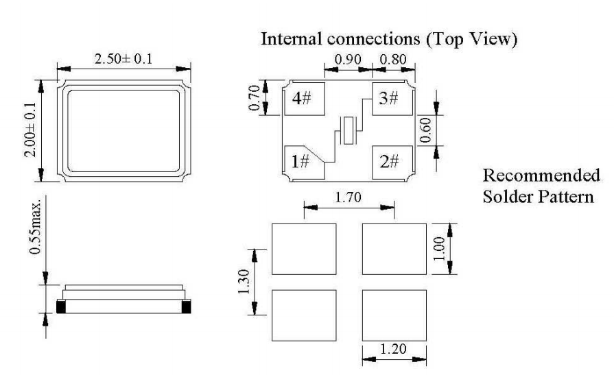 典型的2.5×2.0×0.55 mm超薄SMD晶體